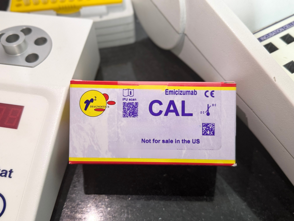 The principle of the modified one-stage FVIII assay for emicizumab measurement relies upon measuring the degree of correction of the APTT when patient plasma is added to FVIII deficient plasma. The degree of correction is related to the amount of emicizumab in the patient’s sample. Quantification of the degree of correction is enabled by using a calibration curve constructed using the Emicizumab Calibrator.